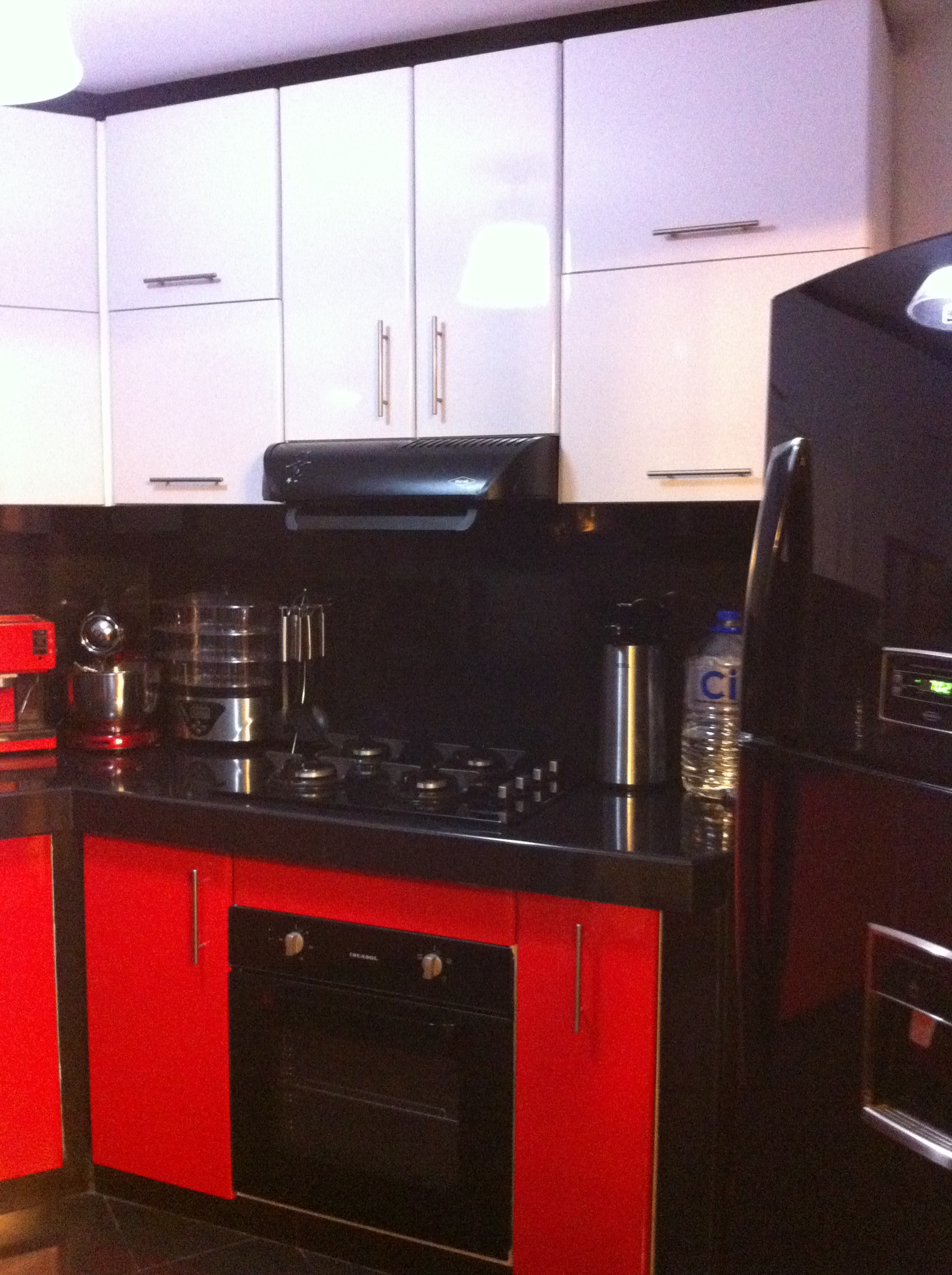 Repostero alto y bajo con puertas de formica rojo y puertas de aluminio con cristales arenados, cajoneras,mesa de granito con cocina y lavadero empotrado.