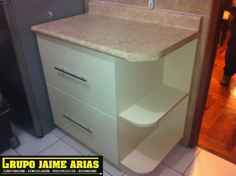 Mesa de granito para cocina empotrada, con cajones (olleros) y condimentero.